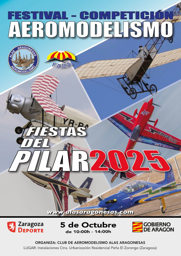 Festival-Competición de Aeromodelismo Fiestas del Pilar 2025 Festival-Competición de Aeromodelismo Fiestas del Pilar 2025 Enlace al álbum de fotos del evento: Artículo siguiente: Festival-Competición de Aeromodelismo Fiestas del Pilar 2024 Siguiente
